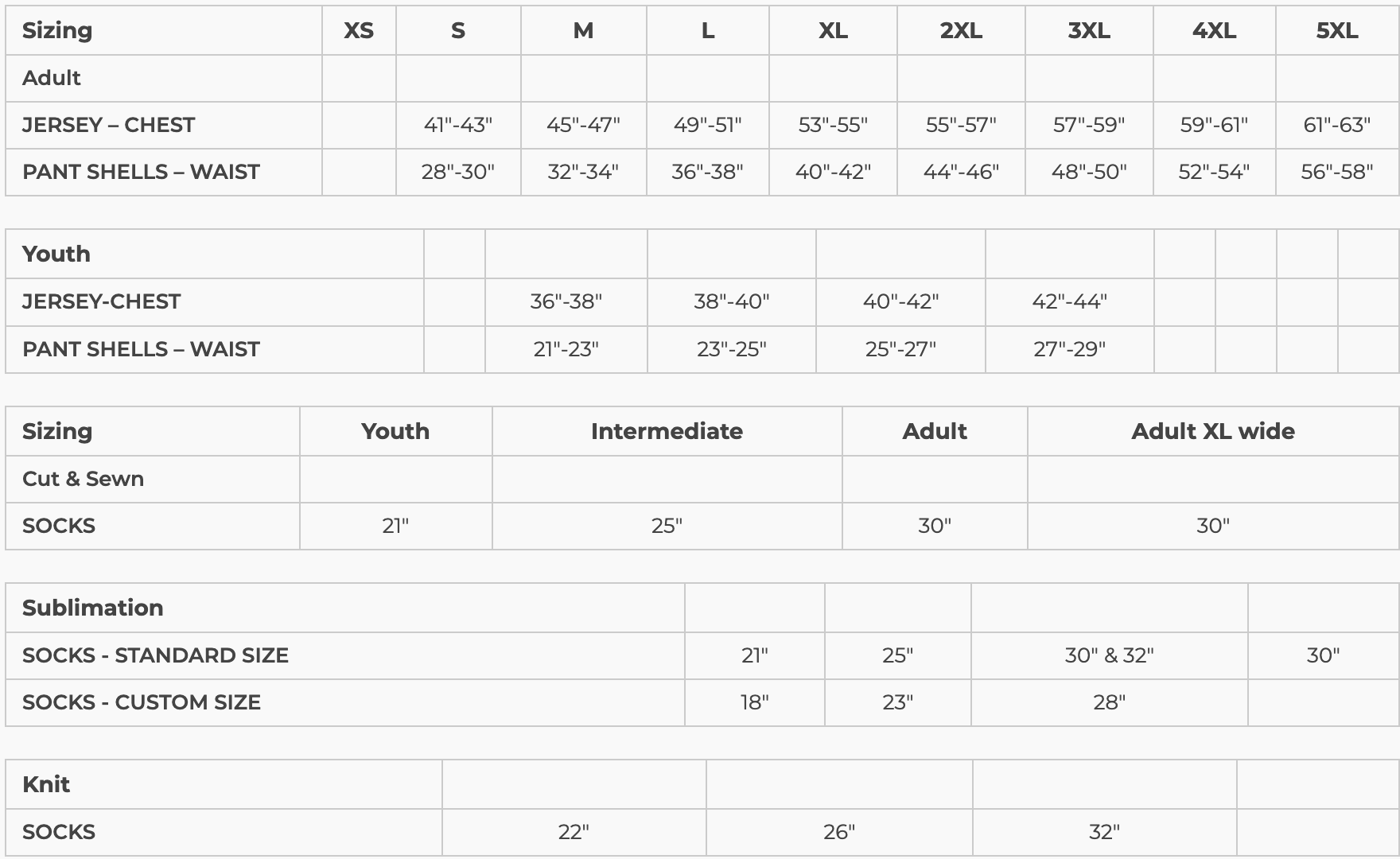 Pick the size(s) and quantities you need for each item.