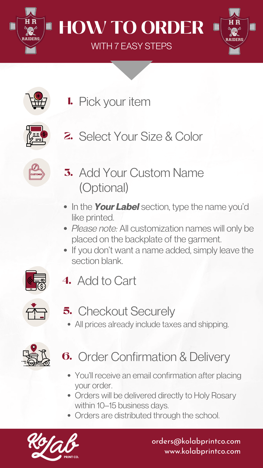 Delivery: Orders are delivered to Holy Rosary within 10–15 business days and distributed through the school.