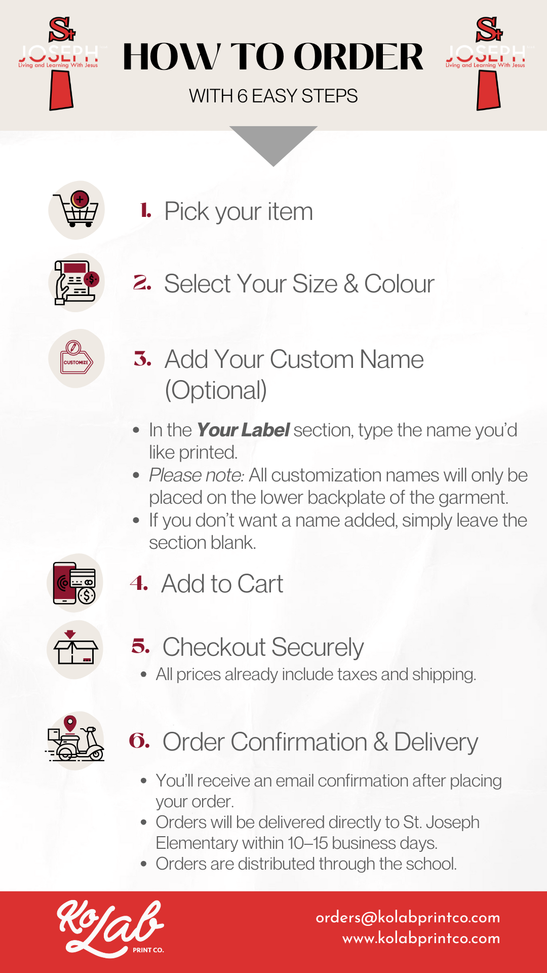 Delivery: Orders are delivered to Holy Rosary within 10–15 business days and distributed through the school.